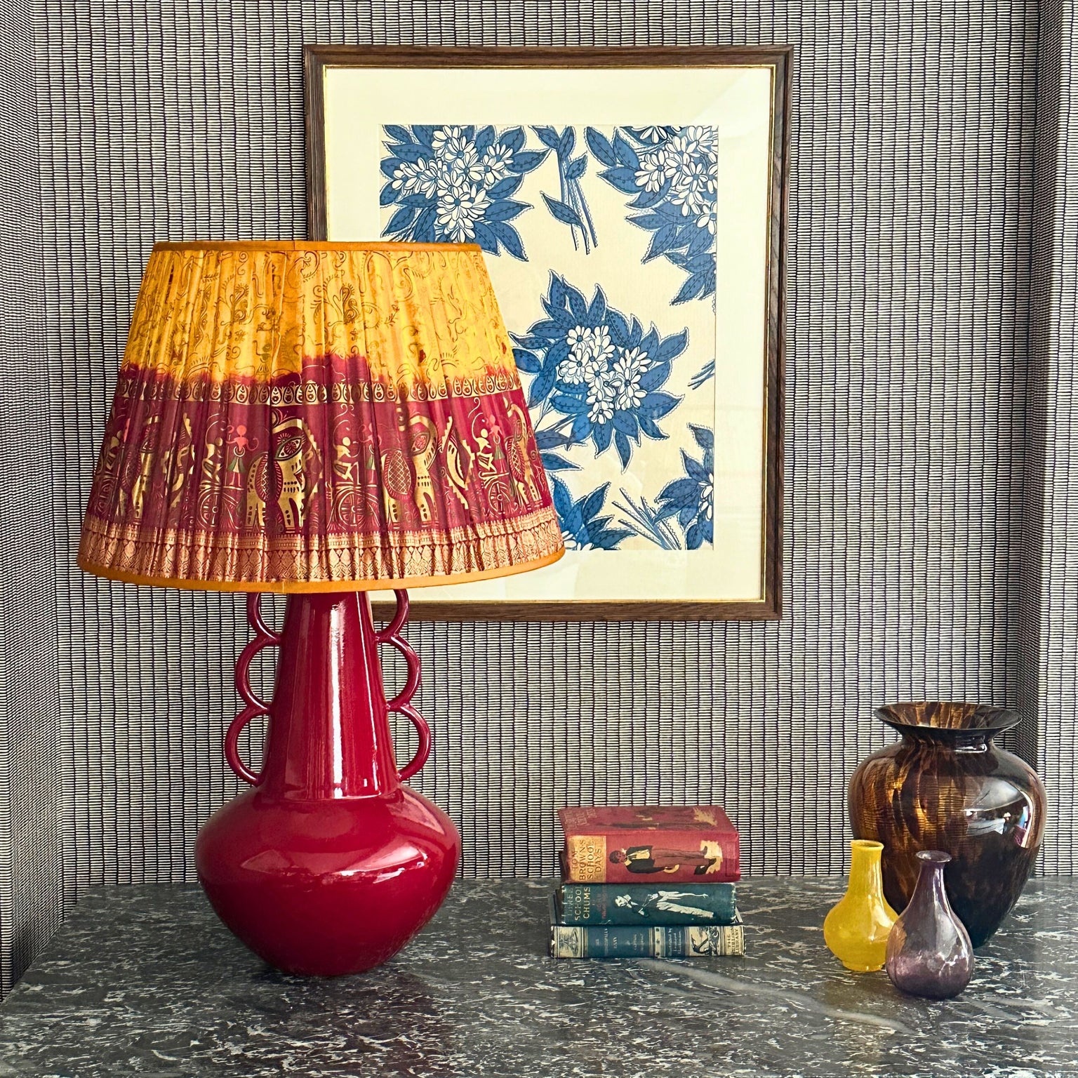 Our gathered silk shades are totally unique: we generally never have more than a pair in any one sari so you're getting a truly one off piece. They are handmade in the UK using vintage silk saris.