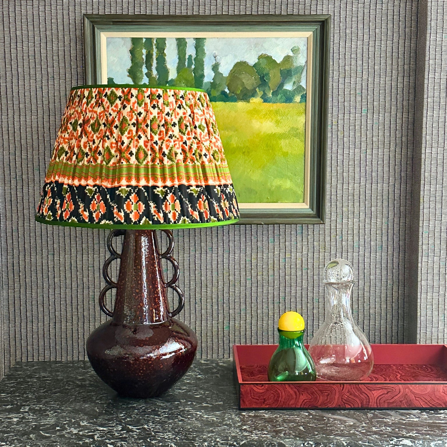 A pretty orange and green gathered silk lampshade with contrasting green silk trim.