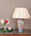 Gathered linen knick knock lampshade with blue silk trim top and a aztec red and black bottom trim.