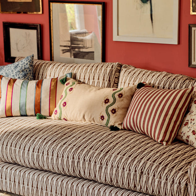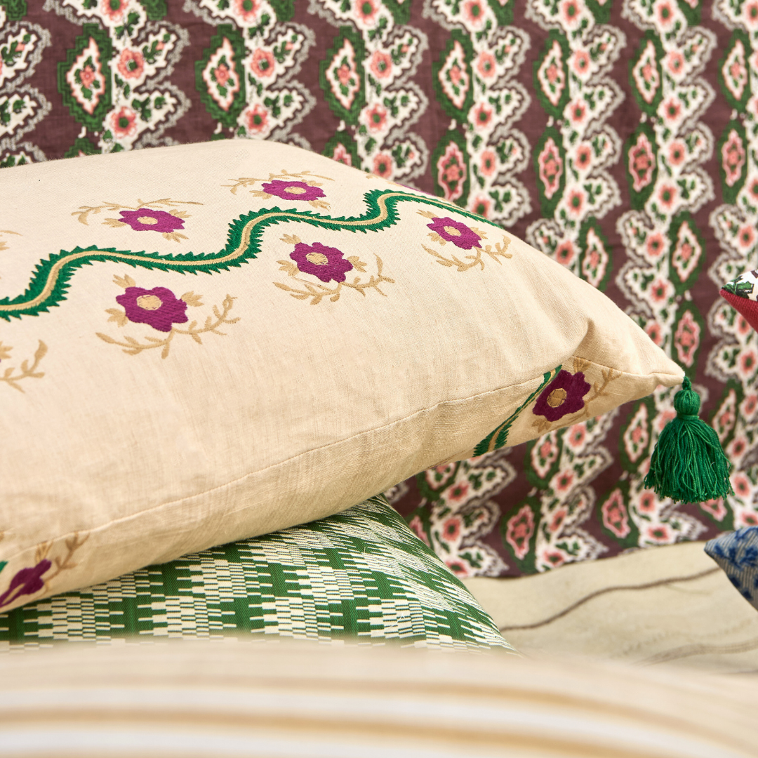 A beautiful cushion in our new Anbu embroidered linen fabric with a cream back and green tassels.