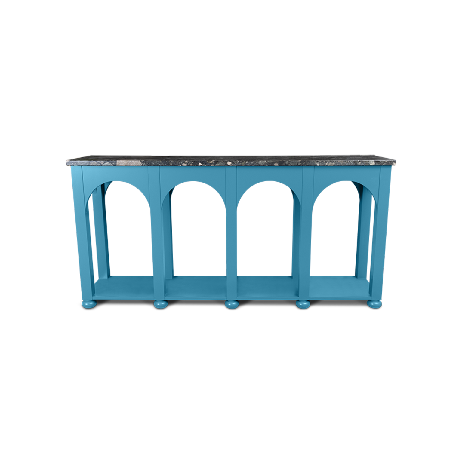This bespoke design was originally made for the hallway in a project that had incredibly high ceilings. Many console tables are minimal in their proportions so we wanted to create a more substantial piece that would work in the space without being overwhelming. The arches with a bottom shelf also allow some storage space and prevent the piece feeling blocky. The bun feet ground the design. A distinctive console that will work in almost any room, in contemporary and more traditional settings.