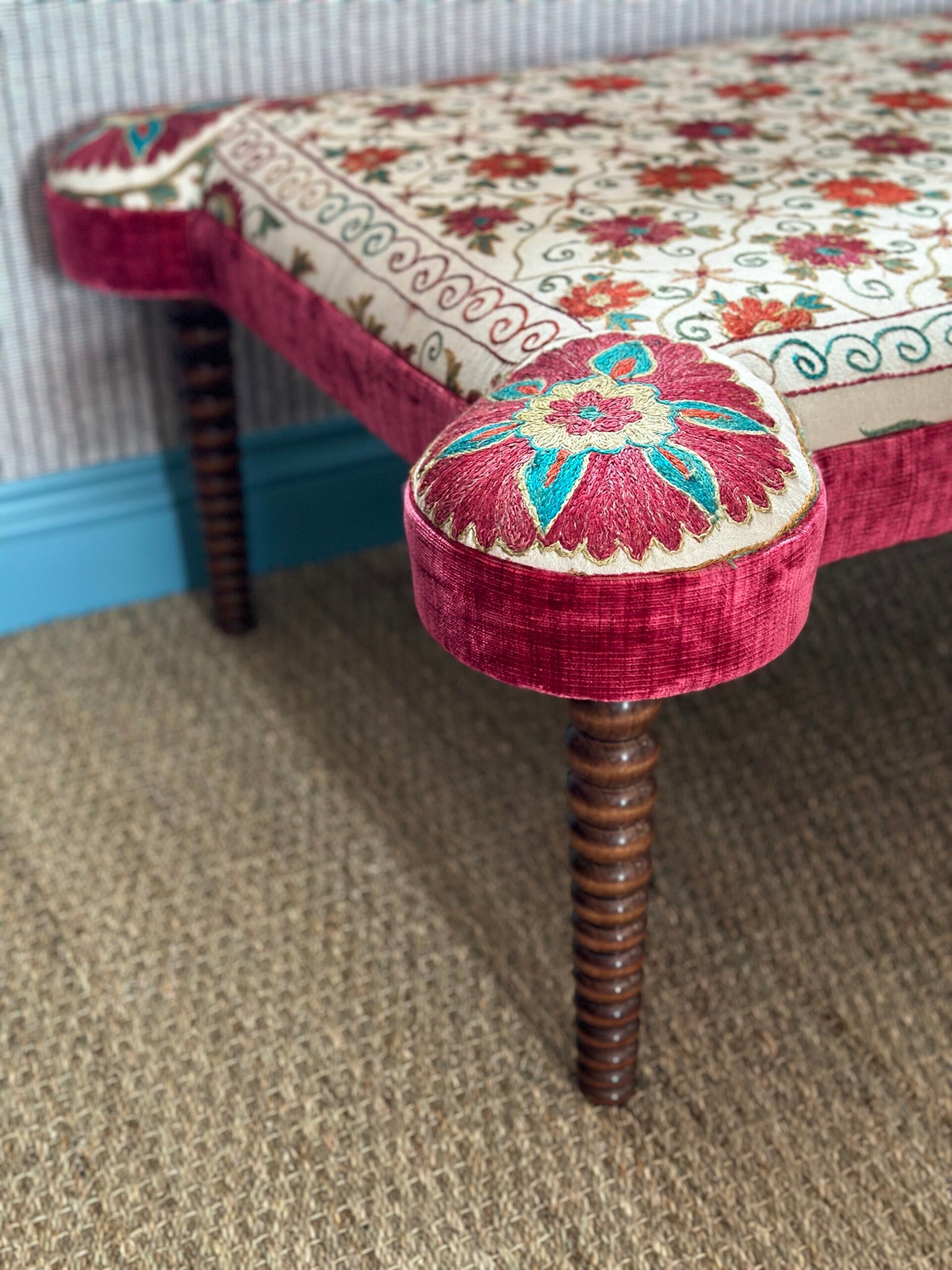 Beautifully crafted unique Ottoman covered in a decorative suzani and edged in a red velvet with bobbin legs.
