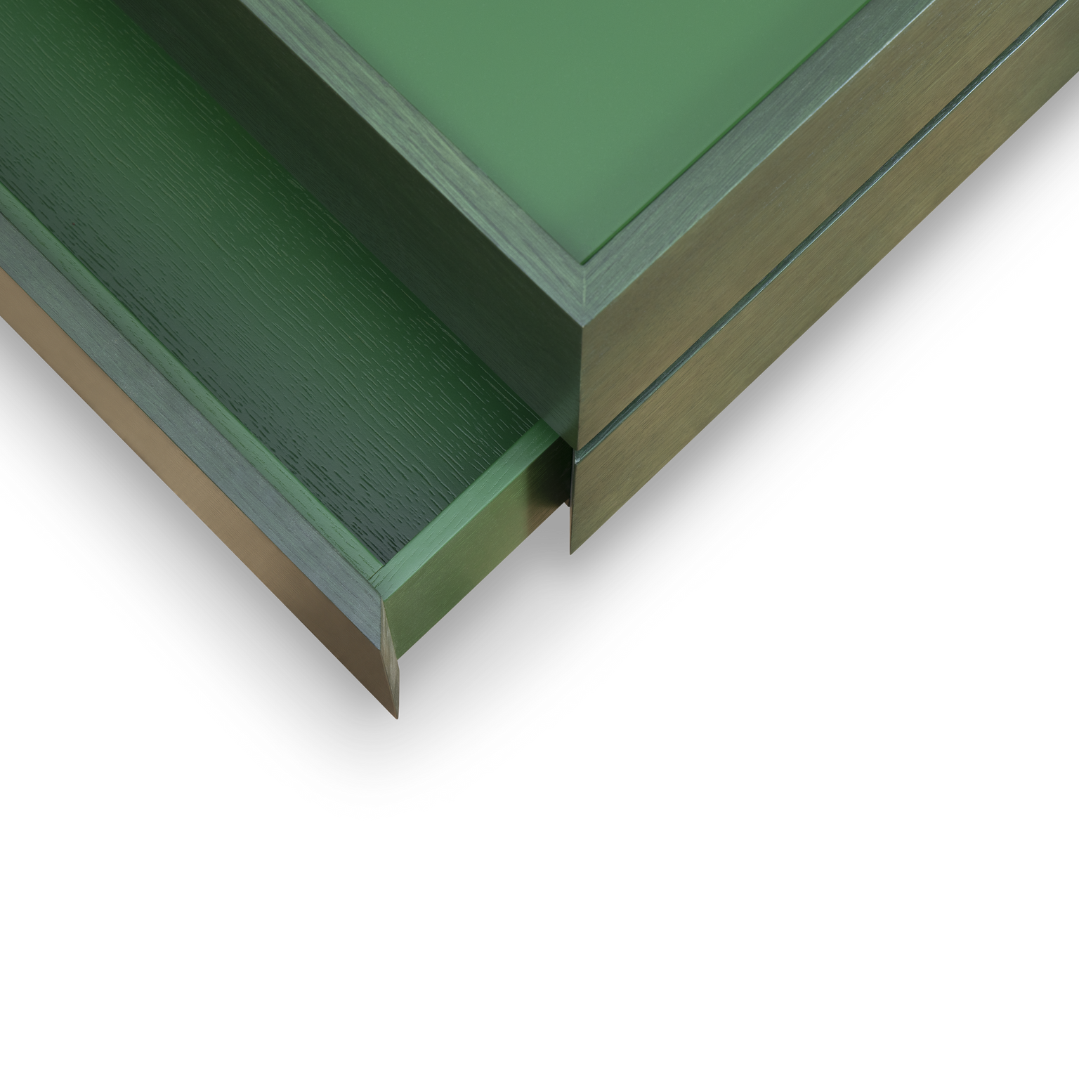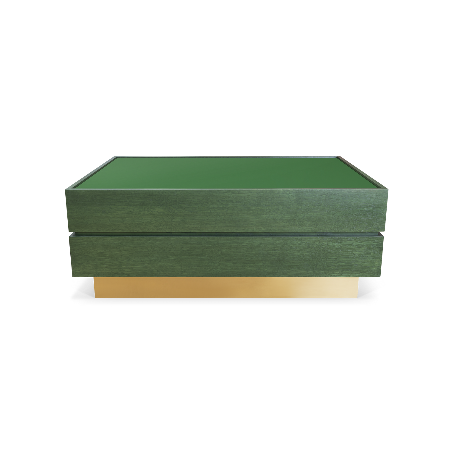 A sleek, clean cut, modern design that will be the centrepiece of any room. Designed with elegant lines and proportions, this distinctive coffee table is also practical with two hidden drawers providing storage for the clutter of everyday life, leaving space for more decorative items on the top. Expertly hand crafted in stained oak. The plinth can be ordered in brass or oak.
