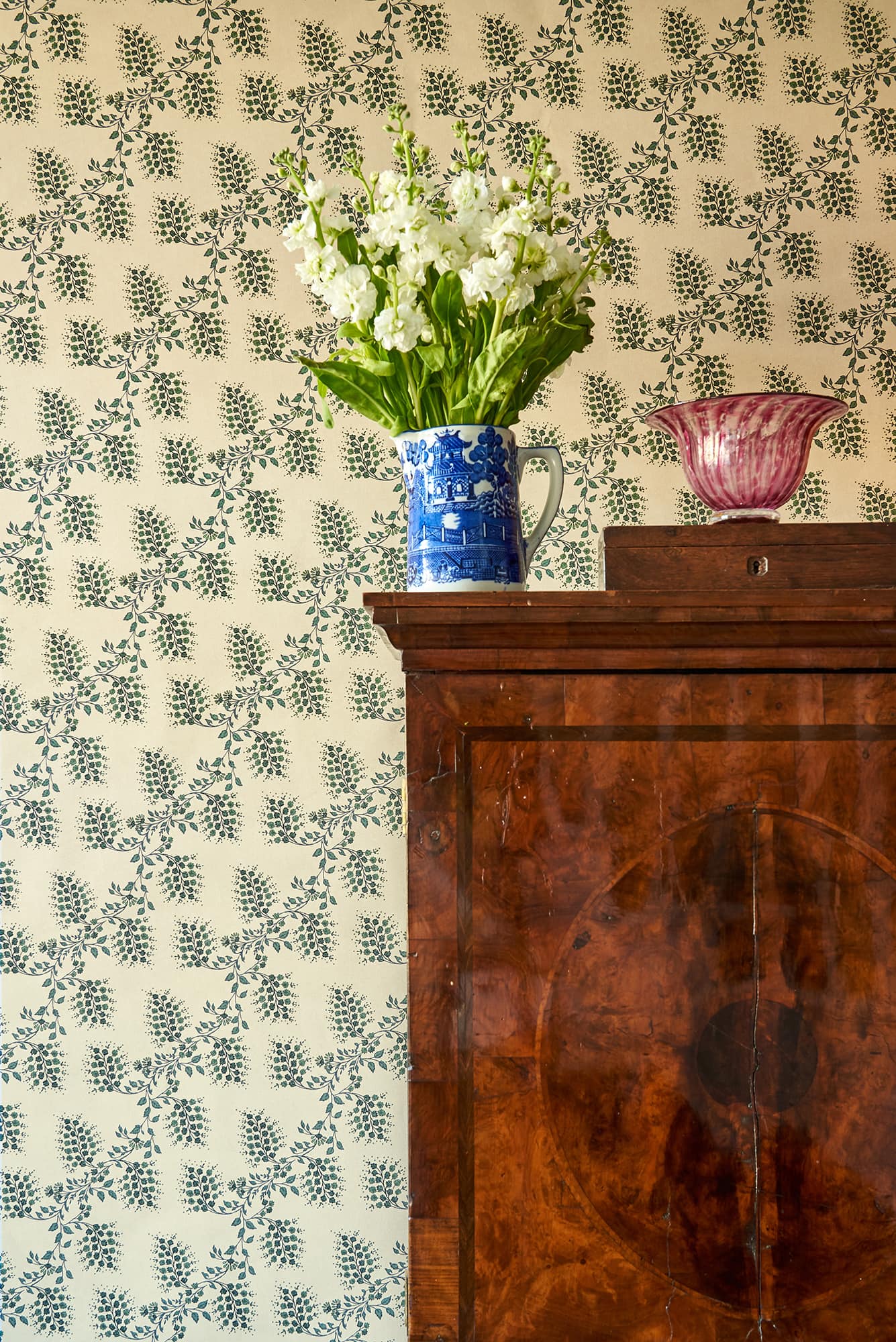 A diagonal, trailing floral available in two scales with delicate leaf motifs and hanging flowers in four colourways. Isabelle works in almost any room large and small, lending itself to both a large open and spacious hallway or as a cosy and inviting bedroom or bathroom.