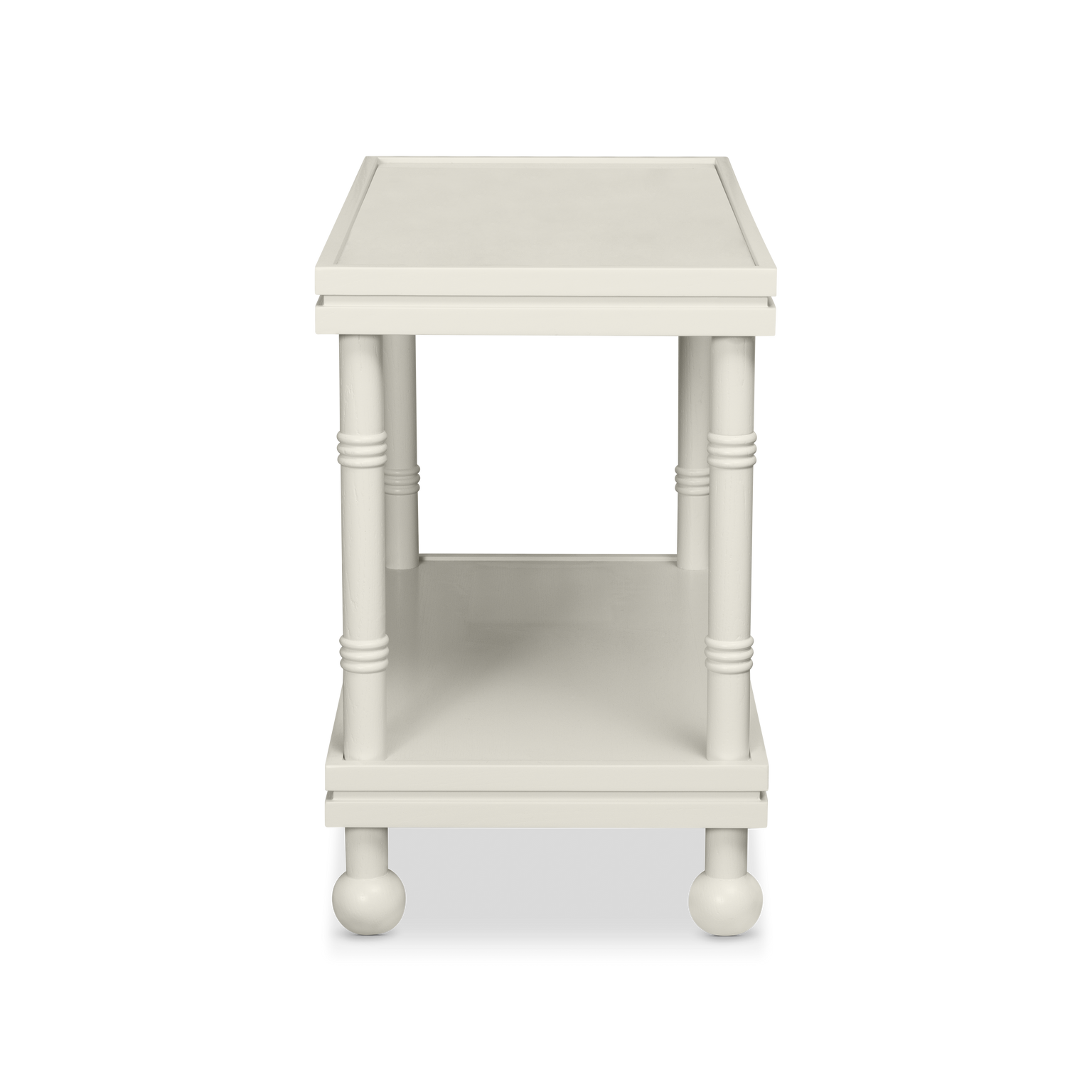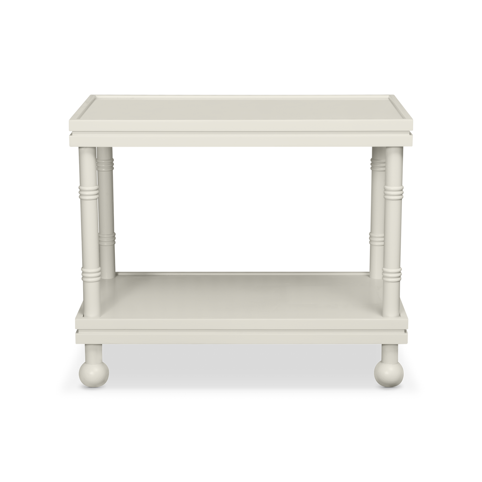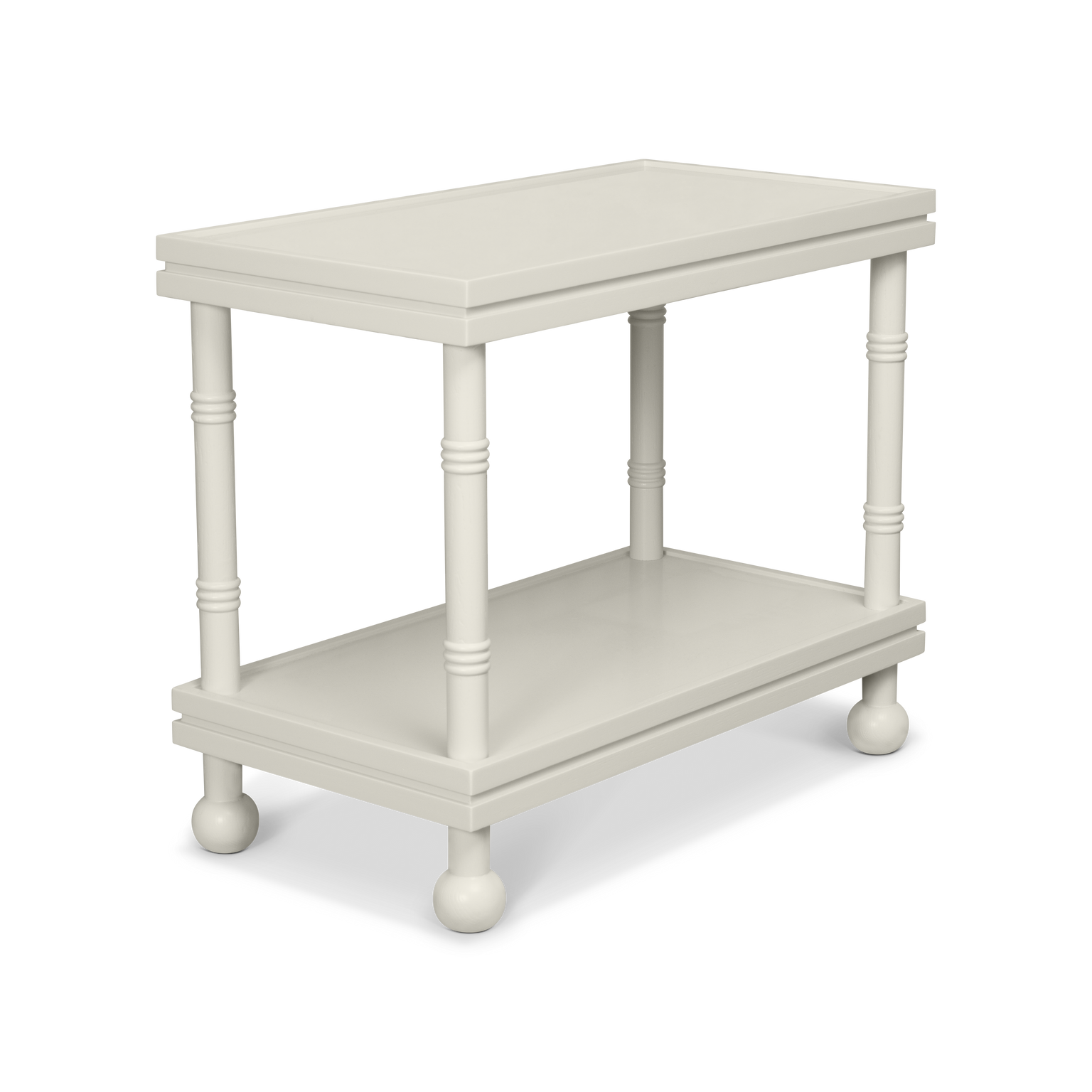 Our variation of a traditional gallery side table. We always think no living space looks “lived in” if there are no books, and therefore we love galleried tables that provide two surfaces, for books on the bottom shelf and a lamp or more decorative pieces above.