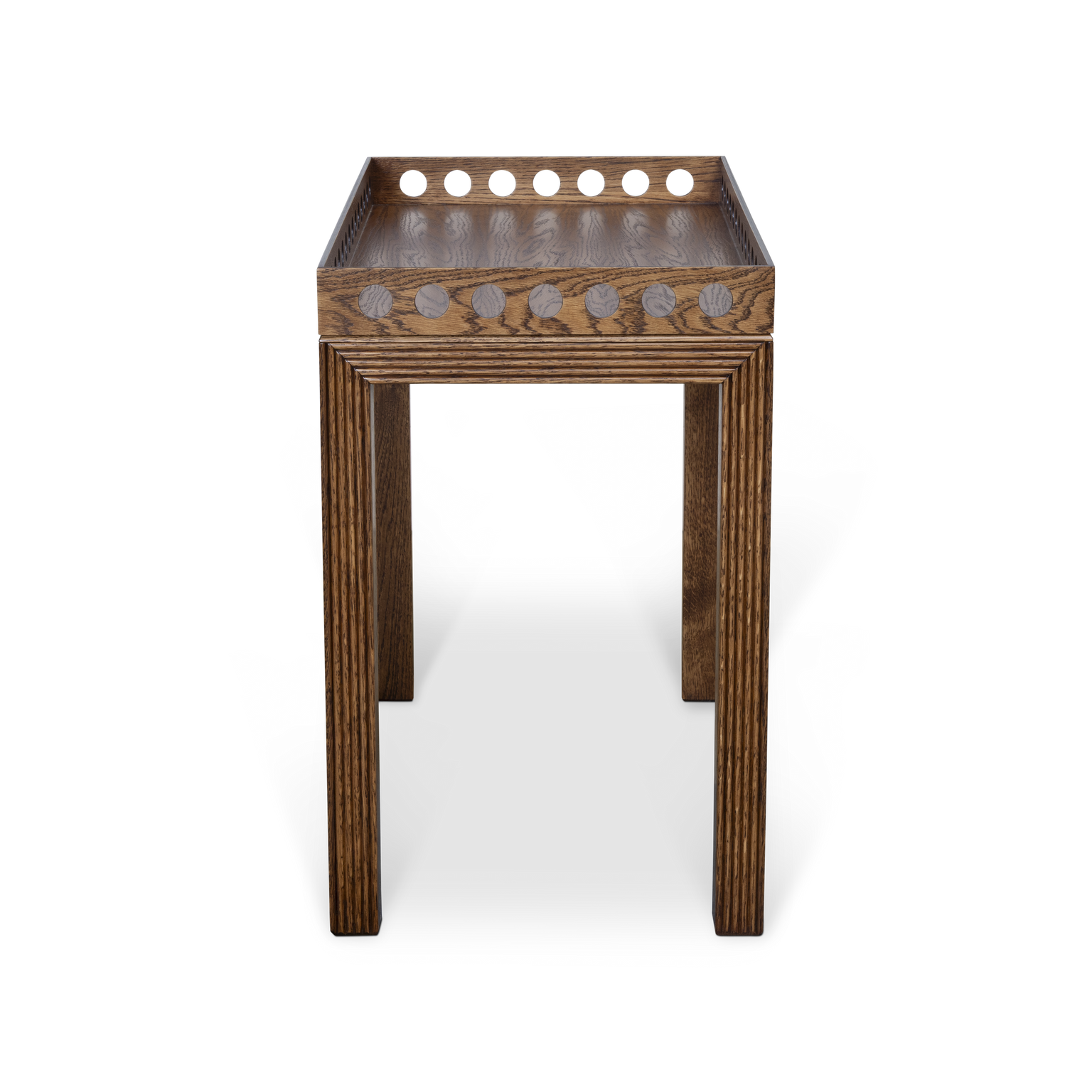 The generous proportions of this side table were chosen when Sarah and Laura were designing a piece to sit in the corner, between two large sofas, often an awkward space fill. It also works in the smaller size to be used at the end of a single sofa or between two armchairs. Expertly hand crafted from oak, which has been stained to a beautiful deep patina, the carved detail on the legs and cut outs on the lipped top elevate this piece from something simple to a statement.